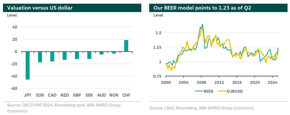 Last week we published our thematic piece on the dollar “Why the dollar is still overvalued” (see more here). The dollar is still overvalued in our view. Both purchasing power parity (PPP) and our own fundamental model estimate point in this direction. PPP helps compare what money can buy in different countries, giving us a better idea of currency value. The graph below on the left shows the results. According to PPP, the dollar is most overvalued compared to the Japanese yen, with a PPP-based overvaluation of about 40%. This measures also implies a 17% overvaluation relative to the euro. The only exception is the CHF, to which the dollar is 19% percent undervalued on a PPP-basis. Using GDP-weights, the PPP analysis suggests a EURUSD valuation of 1.42.