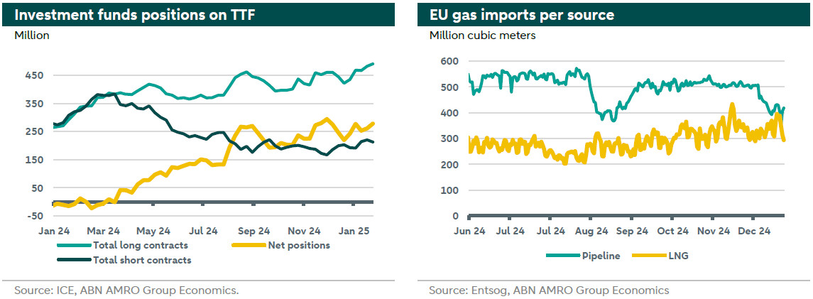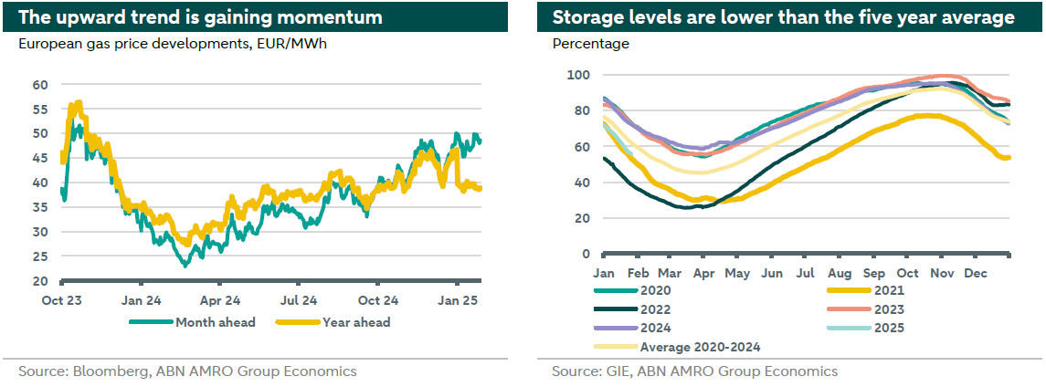Several developments drove the recent surge in TTF prices. First, the end of the transit agreement between Russia and Ukraine and the failure to find a solution to keep pipeline Russian gas flowing to Europe. Even though these flows represent a fraction of the total European imports (5% by end of 2024), the absence of these flow meant higher withdrawal rates from strategic storage and more reliance on already tight LNG markets. In addition, the new US sanctions targeting Russian oil and gas have also contributed to the rally in prices. The withdrawal rate was also catalysed by cold spells seen in January combined with slower wind blow, which increased gas demand for heating and electricity production. Current storage levels (55%) are way below their five-year average (62%) and that of the same time last year (72%, see right hand chart on the previous page).