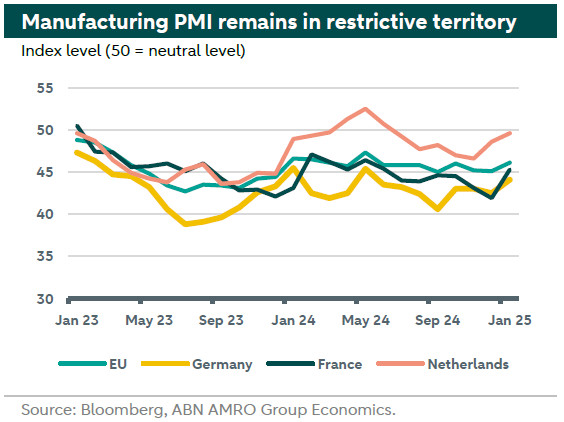 From the demand side, the recovery in European industrial demand still lacks a momentum. The Eurozone composite PMI for January edged up, now just above neutral in expansionary territory at 50.2 (49.6 in December). The eurozone economy is still being held up by expanding activity in the services sector. While manufacturing remains very weak 46.1 (45.1 in December), the pace of contraction eased in main economies, most notably in the industrial heavyweight Germany, as can be seen in the chart on the next page. Current output and new (export) orders contributed to this slight improvement in the manufacturing PMI. At the same time, the expected tariffs under the new US administration will have an adverse impact on growth, leading to a divergence in monetary policy rates across the Atlantic in 2025 (see our global outlook for 2025 ). This is expected to slow down the recovery in industrial demand in the second half of 2025.