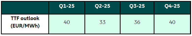 As long as the current geopolitical atmosphere persists and the Ukrainian war continues, we expect prices to stay at elevated levels during the rest of the heating season, though we argue that current month-ahead levels being inflated by speculation. Accordingly, our outlook for TTF year-ahead price is to average around 40 €/MWh in Q1 of 2025 (47€/MWh for the month-ahead contract). Subsequently, we foresee prices to cool off a bit during the summer period, but to remain above seasonal averages, before heading back to 40 EUR/MWh by the end of year. Our outlook for EU TTF year-ahead benchmark is summarized in the table below.