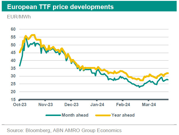 From the demand side, our expectation for the start of interest rates cuts on both sides of the Atlantic remains in June and the impact of monetary easing will take time to feed through to demand. On the other hand, there are signs that inventory cycle in the global industrial sector is turning. Overall, we expect sluggishness in industrial demand in the coming quarter dominating any increase in output driven by lower prices and higher competitiveness. In the power sector, output from renewable power resources has been increasing with more deployments of solar and wind projects, which reduces gas demand for conventional power generation, however, this also means higher vulnerability to weather conditions for gas markets. At the same time, a surge in coal prices, following escalations in the Ukrainian war, made gas more attractive for power generation which induced a surge in TTF price last week. Another factor that also put an upward pressure on prices is the decrease in gas flows to the Corpus Christi LNG export terminal in the US, one of Europe’s biggest suppliers of LNG. We perceive these episodes to be temporary and do not expect their effects to persist.