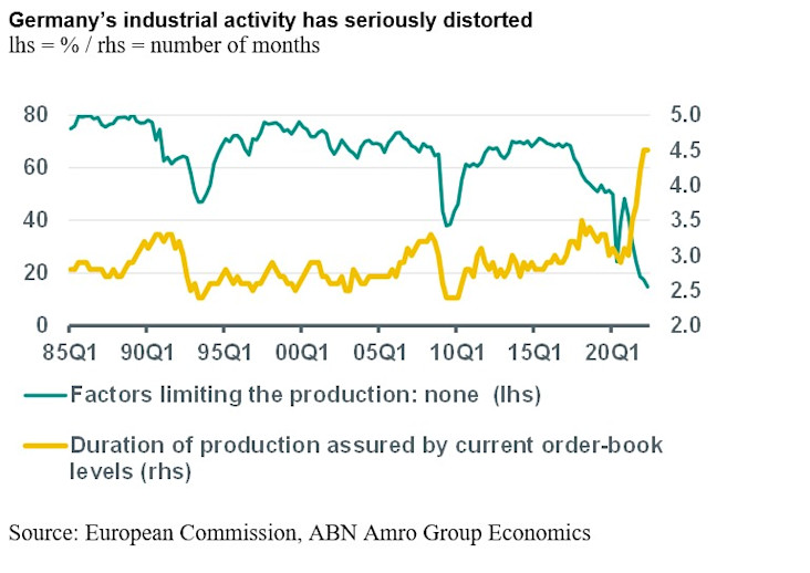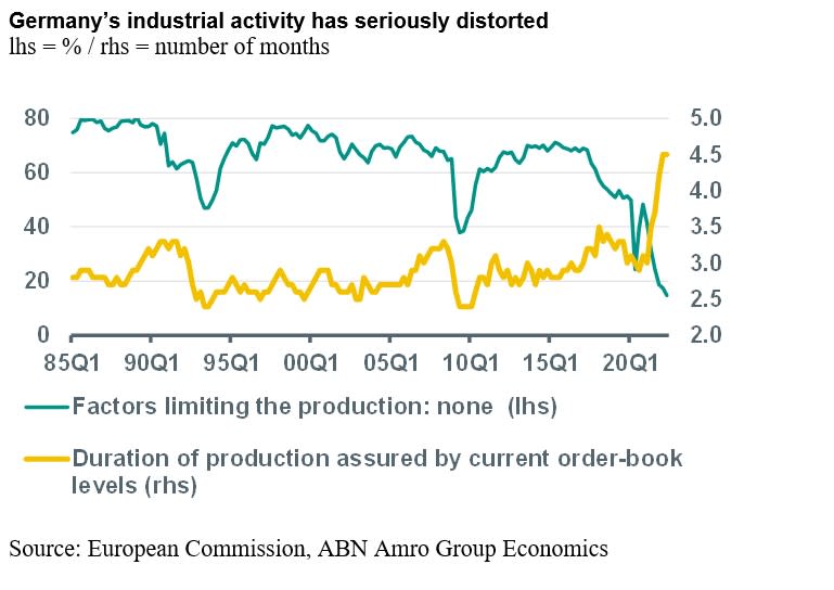 However, there still seems to be room for a temporary acceleration in production in the course of this year. Indeed, large backlogs have built up in recent quarters, as production was limited by supply chain bottlenecks and shortages of labour. The European Commission’s recent survey amongst Germany’s industrial companies showed that the volume of order books had reached the equivalent of 4.5 months of production in Q2, which is the highest level since the start of the series in 1985 (see graph). At the same time, the share of companies reporting that the level of production was not limited by any factors (eg. shortage of material and/or equipment or shortage of labour) dropped to an all-time low of 15. As such, production should bounce back once these obstructions ease, which we expect to happen in the course of this year. However, subsequently, we expect the sector to lose momentum again next year, as the global economy and world trade are expected to slow.