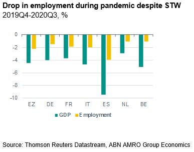 The eurozone labour market has deteriorated rapidly during the pandemic, despite the wide use of government subsidised short-time work schemes (STW). STW is designed to allow companies to temporarily reduce the number of working hours of employees (often to zero) while keeping them on the payroll. The government reimburses the companies what they have paid to these employees, which often is around 70-80% of their normal hourly pay. According to the methodology used by national statistics bureaus, all persons that are in STW are recorded as being employed, even when working zero hours. Despite the use of STW, employment dropped by 2.2% (equal to 3.6 million jobs) during the period 2019Q4-2020Q3.