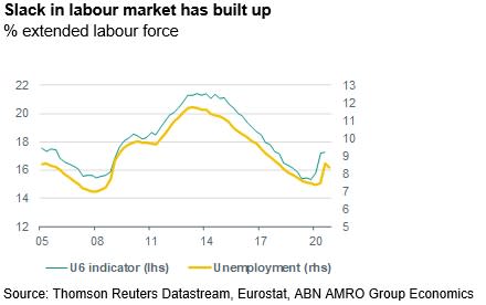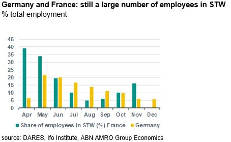 For instance, industrial production in France and Germany has rebounded sharply after April 2020 and has not been hindered by new lockdown measures since then. In France, manufacturing output was merely 3% below pre-pandemic levels in November and in Germany around 3.5%. Still, in France 19% of all employees in the transportation industry and 15% of employees in other industrial companies still were in STW in November. In Germany 8.5% of all employees in manufacturing still were in STW (see graph below). In Germany’s metal industry more than 15% of all employees were in STW in December and in mechanical engineering 15% as well. The fact that STW schemes were still widely used in these parts of Germany’s manufacturing sector, suggests that the use of the STW represents some hidden unemployment. This means that there is a high probability that a significant proportion of these employees will lose their jobs after all if the STW schemes are scaled back. All in all, we expect the unemployment rate to rise to around 10% by the end of 2021.