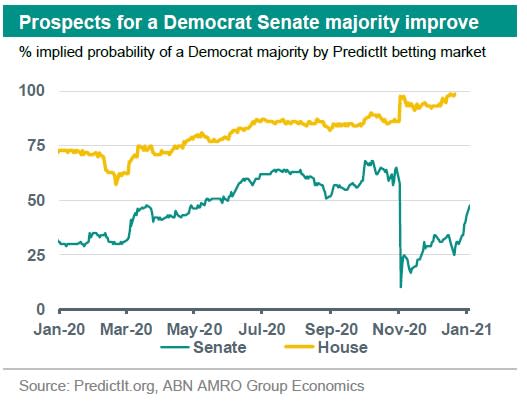 Even a slim Democrat majority would be a game-changer for fiscal spending – Should Democrats indeed win both seats in tomorrow’s election, it would give them a majority of just one in the Senate (50 out of 100 seats, plus the vice president as a tie breaker). A majority in the Senate would mean Democrats controlling all three branches of the executive, giving it the power to pass bills without Republican support. However, such a slim Senate majority means that it would only take one Democratic Senator to rebel to bring down legislation. While this could happen with more contentious legislation for Democrats – for instance, on any potential trade deals, or actions to restrict monopoly power of big tech companies – it is unlikely to thwart policies that tend to unite Democrats, including the major spending plans of president-elect Biden (such as the $2trn renewable energy investment plan, or a follow-up to the recently passed $900bn pandemic relief package, which required compromise with Republicans in order to be passed). If anything, it could lead to even more spending, as Senators might make individual spending demands in return for their support. Our base case for the US currently assumes a continued divided executive, and therefore more modest spending that is constrained by the need for Republican support. Should Democrats win both Senate seats, higher expected spending would pose upside risks to our US GDP forecasts.