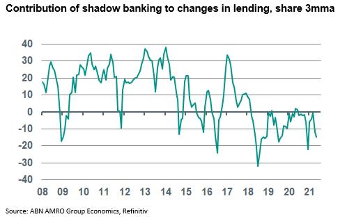 China Macro: Gradual, targeted lending slowdown continues – China’s May data on lending and monetary aggregates published on Thursday morning point to stabilisation compared to last month. Money supply growth (M1 and M2) more or less stabilised in May, after a clear deceleration in the first months of this year. Lending aggregates (total financing and new bank loans) grew by similar amounts as in April, and – on balance – came in quite close to consensus expectations. In annual growth terms, aggregate financing continued its gradual slide, dropping to a 15-month low of 12.2% yoy (April: 12.3%). Looking beneath the surface of the headline numbers, the crackdown on shadow banking continues, with the negative contribution of shadow banking components to total financing picking up again over the past few months – see chart. All in all, the slowdown of credit growth continues to behave in a gradual manner, and suggests that the government is on its way to reach the goal of capping the pace of credit growth to that of nominal GDP growth this year. All this fits to Beijing’s stronger focus on financial de-risking, with the credit cycle having turned now that China’s economy has largely recovered from the pandemic shock. (Arjen van Dijkhuizen)