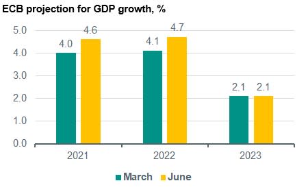 ECB View: ECB will continue higher purchase pace in Q3, despite upgrades – The ECB upgraded its economic outlook and the balance of risks, but decided to sustain the higher PEPP purchases and signalled the need for ongoing easy financing conditions.