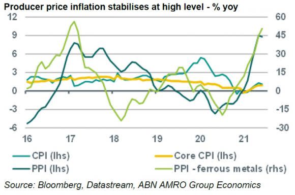Producer prices stabilise in June – Meanwhile, after accelerating sharply in recent months (to a post-global-financial-crisis high of 9.0% yoy in May), producer price inflation (PPI) – released last Friday – showed signs of stabilising in June, dropping slightly to 8.8% yoy. This was to be expected given the government measures to contain the surge in commodity prices (the key driver of the PPI rise). Easing food prices and base effects also play a role. Earlier this month, the respective subindices of the manufacturing PMIs for June had already signalled an easing of cost-push inflation in China. Taken together, this should calm some of the fears over a rising contribution from China to global goods inflation. Meanwhile, headline CPI inflation dropped back to 1.1% yoy in June (May: 1.3%), while core inflation was stable at 0.9% yoy. This confirms that there is hardly any pass-through from higher cost prices to consumers. All in all, the latest inflation developments have created room for the PBoC to add targeted support, as illustrated by the recent 50bp RRR cate to ease financing costs for corporates, in particular SMEs.