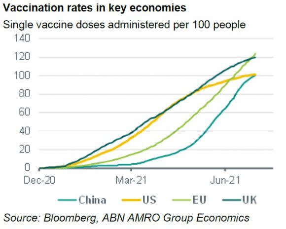 Ramp up in vaccinations should help (services) consumption – Although the effectiveness of the vaccines used in China is reported to be lower than those used in the West, the progress with the vaccination roll-out should help the gradual recovery of (services) consumption to gain traction. We think the latest data will – together with strong June exports – help to reduce fears of a sharp slowdown, that had flared up here and there following weak June PMIs, falling credit growth and a recent easing step by the PBoC. We leave our annual growth forecast for the whole of 2021 unchanged at 9.0% for now, and would again emphasise that this relatively high growth pace is mainly driven by the strong base effect in Q1. Quarterly growth will be much lower on average this year than in the last three quarters of 2020, as catch-up effects from the pandemic shock fade.