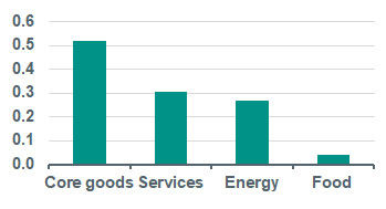 The chart below show the contributions to the acceleration in inflation in January compared to December of last year. Core goods inflation (non-energy industrial goods prices) made the largest contribution followed by services inflation (the other and larger component of core inflation) and energy prices.