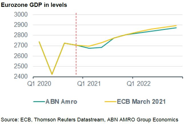 The upward pressure on yields is partly due to increased optimism about the economic outlook. So another focus of investors will also be whether the ECB is also becoming more upbeat. Compared to the ECB we are indeed more optimistic about the second half of the year (see chart below). This reflects the view that the lockdowns will be lifted toward the end of Q2 and especially in Q3. In addition, we have already factored in the impact of improving global developments (the global industrial upswing and the US fiscal stimulus). On the other hand, we are more downbeat than the ECB about the first half of the year given that it assumes better outcomes, which seem unlikely given ongoing lockdowns. These factors seem to offset each other in terms of where the level of GDP will end up in the coming quarters.