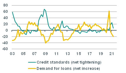 Euro Macro: Banks tighten lending standards, while loan demand declines. The ECB published the results of its latest quarterly Bank Lending Survey (BLS) for 2021Q1 today. It showed that banks, on balance, tightened credit standards on loans to companies further, albeit that the balance of net tightening declined.