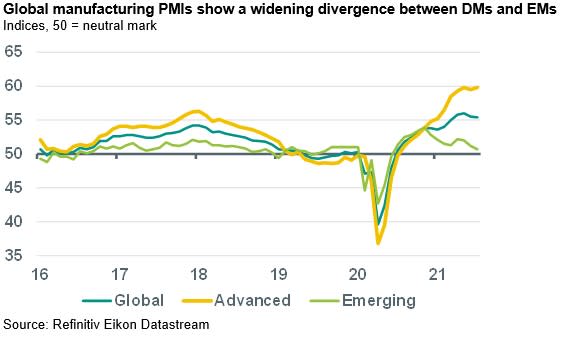 Global Macro: Global manufacturing PMI stable at high level in July – Over the past few days, the monthly manufacturing PMIs were published for a wide range of developed and emerging economies. The global manufacturing PMI edged down slightly, by 0.1 point to 55.4, but remains at a relatively high level (after having reached an 11-year high of 56.0 in May). The most eye-catching development was the widening of the divergence between developed markets (DMs) and emerging markets (EMs). The aggregate manufacturing PMI for DMs rose back to the record-high of 59.8 reached earlier in May (June: 59.5), with a fresh record for the US Markit indicator (63.4). By contrast, the aggregate indicator for EMs fell back to a 13-month low of 50.7 June: 51.2). The strength in advanced economies is arguably primarily due to their lead in vaccinations. This has enabled a reopening of economies and a broadening of the post-pandemic recovery into the services sectors, even though the flare-up of new cases with the new, more contagious delta variant has hampered the reopening process in some countries over the past months.