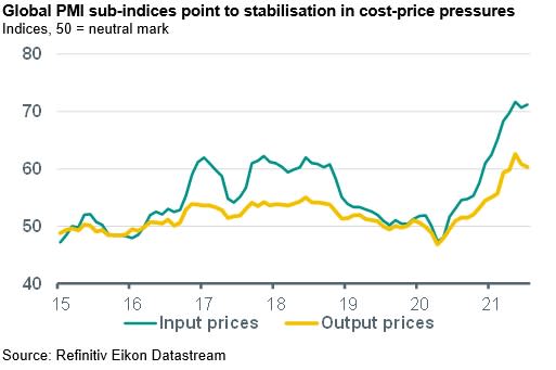 Signs of a stabilization in cost-push price factors – The latest manufacturing PMIs also shed some light on inflationary (cost push) pressures, with the global sub-indices for input and output prices more or less stabilising at high levels. Earlier signals from China’s producer prices also point to a stabilisation, partly reflecting some easing in commodity markets. That said, supply bottlenecks are still in play, with for instance container freight tariffs continuing to rise, and global PMI subindices for delivery times still at record lows (meaning record-long delivery times), particularly in DMs.