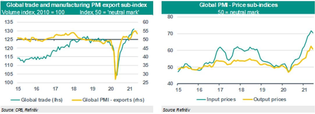 On an aggregate level, the global PMI dropped for the first time in five months (to 55.5), after having reached an 11-year high of 56.0 in May. This drop was broad based, with the global subindices for output, new orders and export orders all coming down in June compared to May. The loss in momentum suggested by this drop could well be related to – amongst others – a rebalancing in global demand from goods to services (led by the US) as economies reopen, to policy tightening in China and some other EMs (the drop in the global PMI in June was mainly driven by emerging economies), and to various supply side bottlenecks (see below). All told, the global manufacturing PMI is still at a relatively high level and remains well above the neutral 50 boundary between expansion and contraction. This suggests that further growth in global manufacturing and trade is on the cards, extending the remarkable recovery from the initial covid-19 shock in early 2020. Indeed, according to the latest CPB data, in April global trade and industrial production were up 25.2% yoy and 18.2% yoy, respectively. This is in line with our view that global industry and trade would be much less hit by virus flare ups and new lockdown measures compared to global services sectors.