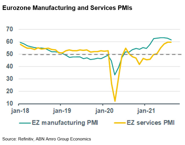 All in all, the result of the August PMIs is in line with our base scenario for the eurozone economy of ongoing robust GDP growth during the rest of this year. We have assumed that the high level of vaccination in the vast majority of eurozone countries will prevent new strict and widespread lockdown measures that would push the services sector back into recession. This should allow GDP to expand by around 2% qoq in Q3 and another 1% in Q4. (Aline Schuiling)