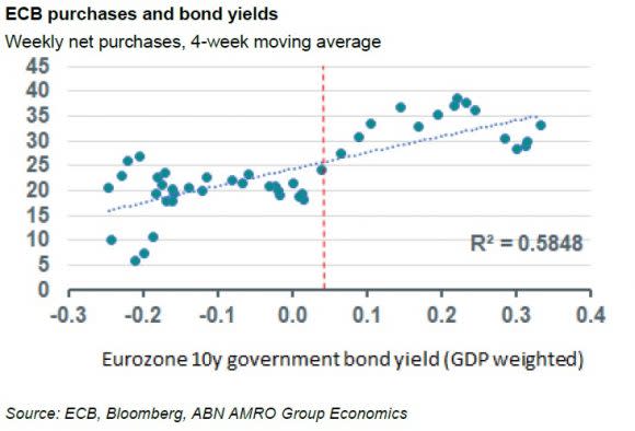 Last week, the average bond yield moved up to above 10bp, compared to levels of around -0.2% at the end of January. However, this week yields dropped again to levels of around 5bp (shown by the red dotted line in the chart). As can be seen, this is getting quite close to the level, which has been consistent with an acceleration in the pace of net purchases in the past. So we may not be too far off more decisive action.