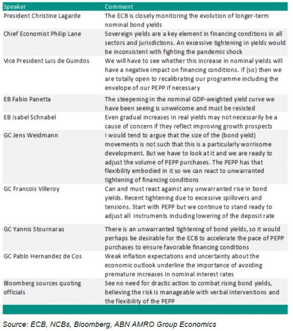 The yield levels the ECB finds acceptable is also determined by the growth and inflation outlook. For instance, if the ECB becomes more optimistic about the inflation outlook, it would likely be more comfortable with a tightening of financial conditions and vice versa. Although the ECB will likely raise its inflation forecast for 2021 in its upcoming macro projections, we think that if anything the outlook for 2022 and 2023 has deteriorated given the rise in yields, the euro exchange rate and oil prices, which each will weigh on economic growth. As such the ECB is likely to remain committed to fighting against any further rise in bond yields.