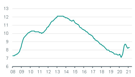 Compared to its pre-pandemic low of March 2020, the unemployment rate has risen by 1.2 percentage points, which is equal to a rise in the number of unemployment persons by around 2 million. Compared to the drop in economic activity since the start of the pandemic, the rise in unemployment has been extremely limited, which of course is partly thanks to the wide use of government subsidised short-time work schemes (STW).