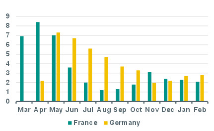 France and Germany have published data for of the use of STW in February. People in STW are considered to be employed. STW is designed to allow companies to temporarily reduce the number of working hours of employees (often to zero) while keeping them on the payroll. The government reimburses the companies what they have paid to these employees, which often is around 70-80% of their normal hourly pay. In France 2.1 million people were in STW in February, which is equal to around 11% of all employees. The use of STW has decreased slightly compared to January, when 2.3 million people (12% of employees) was in STW. Meanwhile, in Germany the number of people in STW rose to 2.8 million in February, up from 2.7 in January. As a share in total employment STW rose to 8.5%, up from 8.1% in January. The STW reports for Germany and France indicate that the full-time equivalent of the use of STW is roughly half of the number of people in STW. In the hypothetical case where all the people in STW (full time equivalent) would have become unemployed, France’s unemployment rate would have been more than 11% in February instead of the 8% that was reported by Eurostat, while Germany’s would have been close to 8% instead of 4.5%.