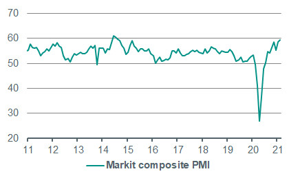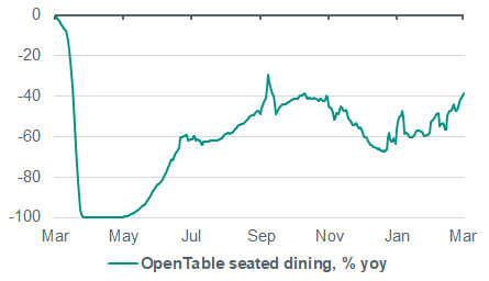 In notable contrast to trends we are seeing in Europe (see our Daily from yesterday), the US recovery pace picked up a notch in the early part of 2021. Following a significant rebound in retail sales and solid industrial production growth in January, the ISM and Markit PMIs suggest both services and manufacturing continued to recover rapidly in February, with the Markit Composite PMI rising to 59.5 from 58.7 in January – the highest reading since August 2014. All of this is consistent with the ongoing easing of restrictions throughout the US. The hospitality sector has now largely reopened, following moves by New York and California in January to reopen restaurants, and some states have even started easing capacity restrictions on hospitality – for instance in Texas and Massachusetts. This has led to a continued recovery in indoor dining, with the latest 7-day average of OpenTable data showing dining 39% below normal levels, a big improvement from the 57% shortfall in January. As a result of this, we expect Friday’s February payrolls data to show a big rebound in jobs growth – we project a 300k rise in payrolls, much higher than the 195k expected by the Bloomberg consensus. With that said, we also expect the reopening to drive a pickup in the participation rate, which remains around 2 percentage points below pre-pandemic levels. While there is significant uncertainty over how quickly discouraged workers will return to the labour force, we expect this to keep the unemployment rate relatively elevated over the coming year, even with strong payrolls growth.