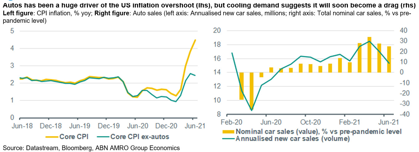 Cooling in demand appears to be hitting prices – The primary driver of the dramatic rise in used car prices – a surge in stimulus-fuelled demand for cars generally – is easing dramatically. At their peak, new car sales were 18.5mn in April on an annualised basis – 10% above their pre-pandemic level, and the highest sales volumes since 2005. This drove total nominal car sales (which also includes used cars) to 34% above their pre-pandemic level. Since then, both measures have declined significantly, and as of June new car volumes were around 8.5% below pre-pandemic levels, and nominal retail sales were 25% above pre-pandemic levels (we believe the massive price rises in used cars are responsible for the still elevated nominal figures, but we will get a clearer read on this when real private consumption data is published at the end of the month). This fall-off in demand appears now to be feeding through to prices – with a lag; high frequency data published by suggests used car prices fell by 1.7% already in the first two weeks of July. By our estimates, this by itself would knock off around 0.2pp from annual core CPI inflation in July. In other words, autos looks set to go from being a significant support for inflation to a significant drag over the coming months – suggesting we likely saw a peak in the June CPI report. (Bill Diviney)