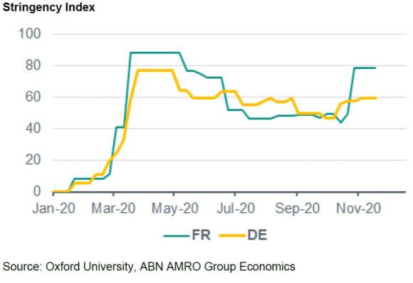 Euro Macro: Germany and France moving in opposite directions – Germany’s composite PMI fell modestly in November (to 52.0, down from 55.0 in October) and remained above the 50 boom-bust mark, which is the level separating contraction in GDP from expansion. In contrast, France’s index fell to levels well below 50 (to 39.9 from 47.5), which is consistent with a deep contraction in GDP. The breakdown in the services sector and the manufacturing PMIs illustrate that the largest part of the gap between Germany and France can be explained by the stringency of the lock down measures that were introduced at the start of November and their impact on the services sector (hotels, restaurants, retail trade). Indeed, France moved into a new partial lockdown in early November, with people only allowed to leave their homes to go to work, seek medical assistance or buy essential goods, while all non-essential shops had to be closed. In contrast, in Germany non-essential shops were allowed to remain open and only parts of the services sector (e.g. bars, restaurants, gyms) needed to be closed. Indeed, Germany’s services sector PMI fell by 3.3 points in November (to 46.2), whereas France’s dropped by 8.5 points (to 38.0). The difference in the extent of restrictions can also be seen in the divergence in the Oxford Stringency Index in the chart below.