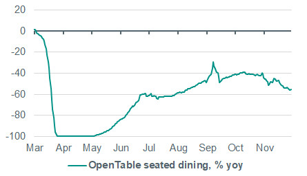 What has the tangible impact of the third wave been so far? The most visible impact has naturally been on the hospitality sector. At least a quarter of the US population lives in areas with bans on indoor dining, and the OpenTable data shows a fall of around 15 percentage points in seated dining over the past month – from around -40% yoy to -55%. The OpenTable data correlates well with the food services category of retail sales, suggesting a sharp drag from hospitality will be visible in the November data (released 16 December). At the same time, consumer confidence is also softening, with the expectations indices in both Conference Board and Michigan surveys falling back to near the lows for the year. With that said, the latest high frequency payments data to 22 November suggests that overall consumer spending has in fact increased, to a shortfall of -2.3% compared to January levels, up from around -5% a month ago (note that this data is seasonally adjusted, although it is not directly comparable to consumption in GDP). As such, while the hospitality sector is clearly being hit by the third wave, it appears consumer spending in other areas of the economy is for now offsetting that weakness. (Bill Diviney)