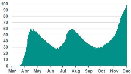Indeed, the third wave in the US continues to put unprecedented strain on hospitals; patients currently hospitalised with covid-19 are on the cusp of topping 100,000 – far above the previous peaks in the first and second waves of around 60,000. To put this number in perspective: adjusted for population differences it is around double the peak number of hospitalisations we have seen in the Netherlands, which has been hard hit by European standards. Despite this, most states have so far resisted imposing even the most basic of new restrictions – the banning of indoor dining in restaurants – and yet some of the hardest hit states that have not tightened restrictions at all are seeing case numbers start to come down. Quite how this is happening, when many European countries have needed renewed lockdowns to curb case numbers, is not entirely clear. What is clear is that Republican states in particular are highly averse to lockdowns and will only implement new restrictions if hospital capacity becomes overwhelmed. For the US as a whole, case numbers remain elevated at around 160,000 new infections per day, but have at least stopped accelerating in recent weeks. We continue to think more states will follow in implementing partial lockdowns, but the breadth and the strictness of these lockdowns now looks to be less than we expected in our base case – suggesting upside risks to .