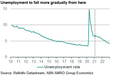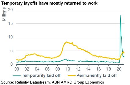 Supportive of the labour market will be the ongoing reopening of the economy, as well as the huge amount of fiscal support – both already enacted but also in the pipeline. However, most of the ‘low-hanging fruit’ in labour market gains has already happened; 15m of the total 17m temporarily furloughed staff since the start of the pandemic have returned to their old jobs, leaving around 2m furloughs remaining. The other 2.3m in (newly) unemployed are permanent layoffs, and some of the currently furloughed staff are likely to join the ranks of these permanent layoffs as the economy adjusts to the post-pandemic new normal. Indeed, some of the changes brought about by the pandemic – such as increased home working and reduced business travel – are likely to prove structural in nature. Workers that are dependent on such pre-pandemic patterns of demand, such as those in the hospitality sector in business districts, are likely to be more vulnerable to being permanently laid off. This more frictional unemployment will take longer to fall, with retraining and reskilling likely necessary.