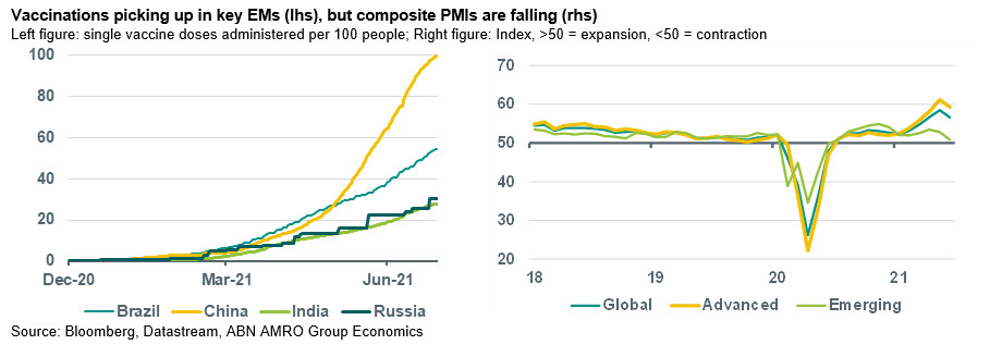 EM growth downgrades, but broader outlook still positive – Regarding the macro-economic impact, strikingly, emerging economies have been the main driver of the recent slide in the global PMIs, particularly for services (see chart with composite PMIs). This reflects virus flare-ups, but also other factors like policy tightening in some countries, or the effects of supply-side bottlenecks. For instance, the sudden drop in China’s services PMIs in June is partly related to regional virus flare-ups and a re-tightening of mobility restrictions that has delayed the recovery in (services) consumption. In India, the services PMI has fallen back sharply following a major virus wave in the spring, and a jump in its Stringency Index in April/May, even though the GDP impact thereof will likely be much smaller compared to the stunning shock (-24.4% yoy) seen in Q2-20 (also see our contribution on India’s covid-nightmare in our May Global Monthly). We have cut our growth forecasts for a couple of EMs, particularly in South Asia reflecting these virus flare-ups and new mobility restrictions (e.g. India, Indonesia, Malaysia) but also in view of the ongoing drag on tourism revenues as normalisation of international tourism is delayed (e.g. Thailand, Philippines). That said, the overall impact on EM growth for 2021 looks to be quite manageable for the moment (a few tenths of a percentage point), also taking into account that EMs generally profit from the rebound in global industry and trade following the reopenings of key economies. As such, the reverberations for the US and the eurozone are also likely to be relatively small. (Bill Diviney, Arjen van Dijkhuizen, Nora Neuteboom)