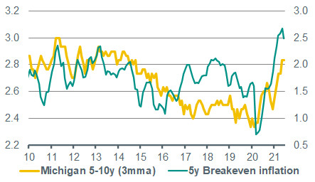 Autos could become a drag on inflation in coming months – With demand for cars now cooling – sales fell in May, and June retail sales are likely to show a further fall when they are published on Friday – the upward push from autos on inflation could well go into reverse in the coming months and become a drag. A compounding factor is likely to be improvements in supply, as bottlenecks (for instance in semiconductors) ease. A looming drag from autos will be partially offset by continued catch-up growth in services categories of inflation, but June is likely to represent the peak in both monthly and annual inflation. A further factor supporting the ‘transitory’ view on the current inflation overshoot is inflation expectations. Market-based expectations are around 20bp off highs in mid-May, and the University of Michigan consumer-based expectations have stabilised at levels consistent with the Fed’s 2% objective. All of this does not mean there are no risks to the inflation outlook. In particular, labour market bottlenecks continue to be a concern in the US, and it remains to be seen how quickly labour supply will catch up with demand as unemployment benefit top-ups expire, and schools and childcare facilities fully reopen. However, our base case is that these bottlenecks will not be sustained for long enough to put meaningful upward pressure on inflation. (Bill Diviney)