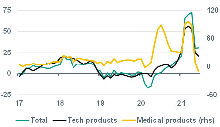 China Macro: A closer look at the buoyant foreign trade data – This morning, China’s foreign trade data for June came in stronger than expected. Exports in dollar terms rose by 32.2% yoy in June (May: 27.9%, consensus: 23.0%), while imports grew by 36.7% (May: 51.1%, consensus: 29.5%). Month over month, exports grew by 6.6% in June and imports by 5.3%. The June data suggest that China’s strong export performance during the pandemic is still holding up. This reflects the clear rebound in external demand following the reopenings of China’s main trading partners’ economies, but likely also price effects. Specific demand for medical supplies and IT products has for long been a key driver of this outperformance during the pandemic, but this effect has faded as the pandemic has shifted into a new phase. Going forward, export growth will likely drop in the second half of the year, as is also indicated by recent weakness in China’s PMI export-subindices. This partly reflects base effects, while supply side bottlenecks (e.g. scarcity in semi-conductors and in containers and container ships) will continue to be a headwind. Drags will likely also arise from virus flare-ups with more aggressive new variants leading to a retightening of restrictions, particularly in importing countries that are laggards in terms of vaccinations. Meanwhile, ongoing strength in Chinese imports confirms the pick-up of investment – with consumption still lagging – but also reflects the sharp rise in commodity prices (with China being the largest importer of commodities worldwide). Indeed, China’s volumes of commodity imports (data of which also runs to June) in recent months paint a less buoyant picture than total import values do. (Arjen van Dijkhuizen)