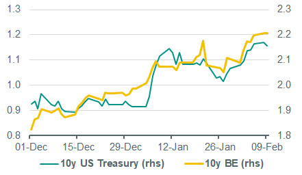 Inflation expectations as well as rate hike expectations have driven US yields higher – The rise in US yields has been driven by both inflation expectations and a more aggressive pricing in of Fed rate hikes. From early December to 10 February, yields rose mainly on higher inflation expectations, with the 10y yield moving in line with the 10y breakeven yield (see left chart). Meanwhile, fed funds rate expectations remained stable. However, in the last two weeks, the rise in yields has been on the back of more aggressive rate hike pricing by the market. This is reflected in 3y ahead short term rate expectations. Future short term rate expectations are an important driver of longer-term yields, and both the short term rate expectations 3y ahead and the 10y real rate increased by almost 30bp over the past two weeks (right chart).