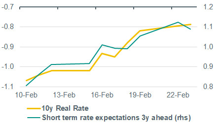 While financial markets have largely digested this change, there is still uncertainty over how precisely the Fed will apply this new framework. As a result, markets have moved rather too hastily in our view to price in a tightening cycle. Alongside the significant rise in inflation expectations, this is one of the reasons bond yields have continued to push higher over the past month. Adding fuel to this move has been commentary that has been comparatively relaxed about bond yield rises (in notable contrast to ECB commentary). We continue to think the Fed will remain comfortable with yield rises for as long as they are driven primarily by inflation expectations – i.e. that real yields are stable. However, more recently that has not been the case, and we have also seen yields rising on the back of a repricing of Fed hikes, pushing real yields higher (see below for more). This will be tolerated to a degree, but at some point the Fed will view such rises as getting out of hand and putting an undue brake on the recovery, through a tightening of financial conditions (which can mean equity market falls as well as interest rate rises). However, before this, the Fed’s own new projections (released on 17 March) will likely show that market expectations for policy rate hikes have gotten ahead of the likely reality.