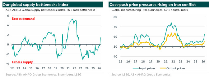 The lengthening of delivery times is just one of the indications of supply disturbances stemming from the Iran conflict. These are so far obviously concentrated in energy-related areas. Still, additional bottlenecks could arise should the ceasefire not hold and/or the conflict re-escalate. Think for instance of the potential closure of the Bab-Al-Mandez Strait – connecting the Red Sea to the Gulf of Aden – by the Iran-affiliated Houthis: this would disrupt global shipping much more broadly than just energy flows. Not surprisingly, our global supply bottlenecks index has risen back to ‘dominant supply bottlenecks/excess demand’ territory. This is not only driven by the lengthier delivery times, but also by the index capturing global supply and demand conditions (the ratio between the EM output index and the DM domestic and export orders index).