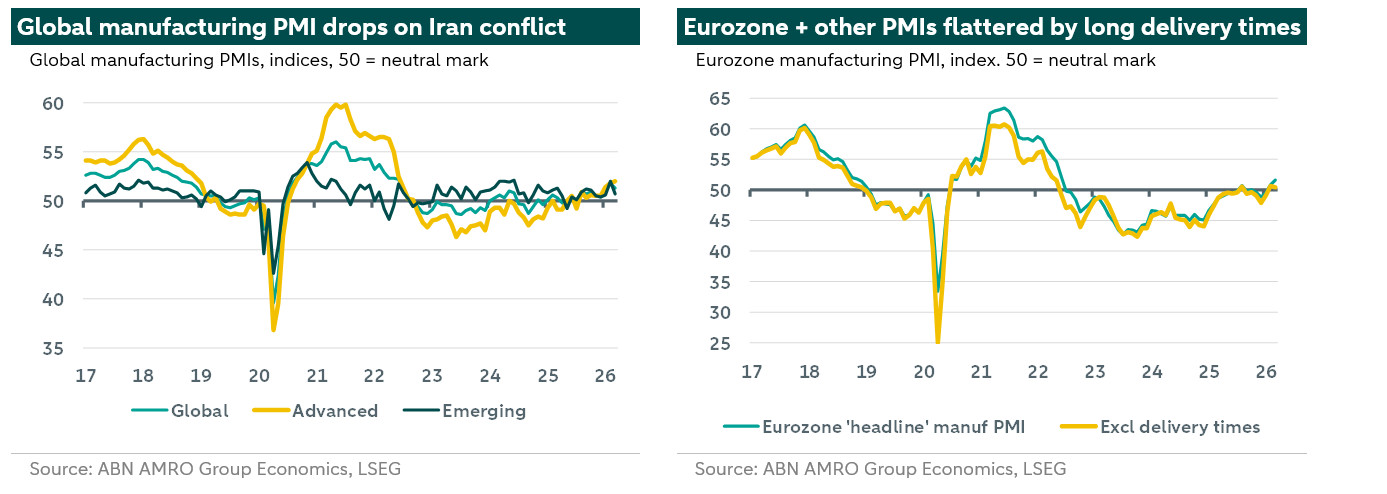 Global manufacturing PMI comes down again in March on escalation of Iran conflict. Relatively strong readings for developed economies flattered by rising delivery times. These are indicative for a broad re-emergence of supply bottlenecks, and rising inflationary pressures.