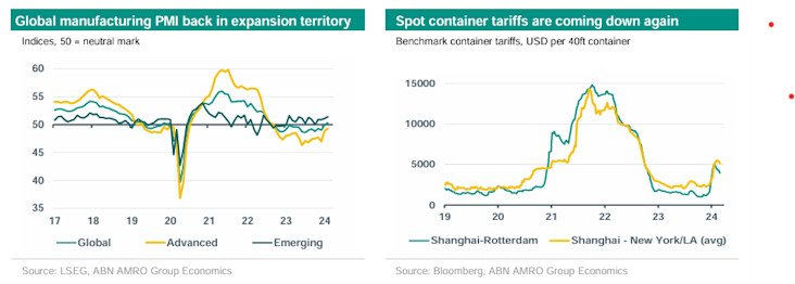 Last month, we noted a significant improvement in the demand-related components of the global manufacturing PMI. In February, the global manufacturing PMI’s component for domestic orders rose further by 0.6 points to 50.4, the highest reading since May 2022 and the first reading above the neutral mark since June 2022. The export orders component also rose by 0.6 points to a twenty-month high of 49.4, although remaining in contraction territory for the time being. Regarding the supply side, the rise in the global output component was even stronger in February, by 0.9 points to a 9-month high of 51.2 (the increase mainly driven by DMs). All in all, supply conditions currently still look a bit stronger than demand conditions, which is keeping inflationary pressures in check. What is more, the impact of recent disturbances in global shipping (Red Sea and Panama Canal) on global industry seems to be ebbing somewhat. The global component for delivery times (which dropped in January, indicating somewhat longer delivery times) rose back above the neutral mark in February, the components for input and output prices have stabilised, and container freight tariffs have come down over the past few weeks following a surge in end-2023 and early-2024. All of this is also reflected in our global supply bottlenecks index, which moved back a bit further into ‘supply abundance’ territory.’