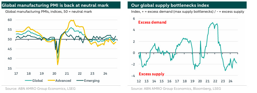 The global manufacturing PMI has risen for the second month in a row, climbing back to the neutral 50 mark separating expansion from contraction in November, up from 49.4 in October. This follows a period of weakening over the summer months. The recent stabilisation in global industry seems to be in sync with the easing cycles in key economies seen over the past few months. (Preparations for) trade frontloading in the run-up to an expected rise in US import tariffs next year may have played some role in the improvement seen in November, and may support a further rebound in global manufacturing and goods trade in the short-term. Longer term, in the course of 2025 and in 2026, we anticipate headwinds from a trade tariff shock to drive a slowdown in global GDP and (goods) trade, which is likely to form a headwind for global industry as well – see our Global Outlook for 2025, The year of the tariff.