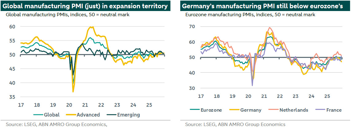On the global scale, supply conditions are still stronger than demand conditions... – Looking at the various subcomponents of the global manufacturing PMI, the supply side in global industry remains stronger than the demand side. On the supply side, the global output component fell by 0.3 points to 50.9; this weakening was driven entirely by DMs. The future output index remained stable and at 60.2 is still well above the neutral mark. On the demand side, the global (domestic) orders component fell by 0.4 points to 50.0, with also here the weakening led by DMs. After a pick-up in November 2025, the global export component dropped back to 49.1, remaining in contraction territory for the ninth month in a row. This contrasts sharply with the resilience in global trade volumes as reported by the CPB (increase of 4.3% y/y in January-October 2025), as highlighted in our 2026 Global Outlook and a related podcast, although the CPB’s index dropped by 1.3% m/m in October. This is just another example showing that the relation between ‘hard activity data’ and survey data like the PMIs seem to have become more complicated in a period of large trade policy uncertainty, given potential impact of shifts in sentiment and the prevalence of practices such as trade frontloading in the run-up to (expected) higher tariffs, and the unwinding thereof.