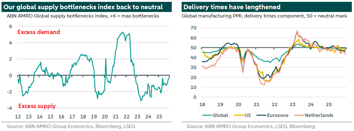 …but longer delivery times (and higher container tariffs) indicate rising supply bottlenecks –Although global supply conditions remain stronger than global demand conditions, our global supply bottlenecks index has moved towards ‘neutral’ in recent months. That mainly reflects more signals of disturbances in global supply chains re-surfacing. The delivery times subcomponent of the global manufacturing PMI dropped further to a three-year low of 48.5 (lower readings imply lengthening delivery times), although remaining clearly above the troughs seen during the pandemic. This drop was driven mainly by DMs, with the DM average (included in our bottlenecks index) falling to a 38-month low of 46.6. Amongst DMs, this subindex is currently the lowest for the UK (45.2), the US (45.8) and the eurozone (45.9). Within the eurozone, the Netherlands’ component for delivery times was even lower (43.2), reflecting issues with China related to semiconductors (Nexperia) and port congestion in Rotterdam (see here). Indeed, more broadly, the delivery times component of the global PMI for electronic equipment – also included in our index – fell to a three-year low of 45.8 in December. Meanwhile, global container tariffs have started rising again since October, although remaining relatively low compared to the peaks seen since the pandemic.