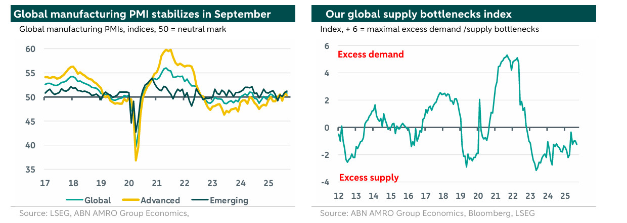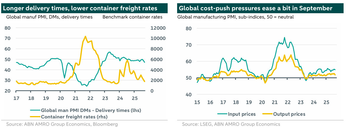 The various subcomponents of the global manufacturing PMI confirm that from a global perspective, supply conditions are still stronger than demand conditions. On the supply side, the global output component fell by 0.5 points to 51.3. This was entirely driven by DMs: the average for DMs fell by 1.7 points to 50.6, whereas the EM average reached a ten-month high of 52.0. Meanwhile, the global future output subindex rose further to a three-month high of 60.1. On the demand side, the global component for new (domestic) orders was stable at 50.9: the average for DMs fell back to contraction territory (49.3) while the EM average rose to a seven-month high of 52.3. The global export orders component rose to the highest level since ‘US Liberation Day’, but at 49.5 remained in contraction territory. The average for EMs rose back to expansion territory (50.9) for the first time since March, while the DM average edged up to a three-month high of 48.2. The fact that global supply conditions remain stronger than demand conditions is also illustrated by our global supply bottlenecks indicator, which remains in ‘excess supply’ territory (the ratio between DM orders/export orders and EM output is one of the ingredients of our index).