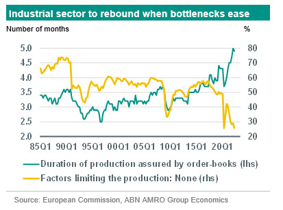Industry is also likely to make a positive contribution to growth in H2 2022, as despite signs of cooling goods demand, there remain large backlogs of orders that will continue to support activity over the coming quarters. This backlog has been due to supply chain bottlenecks and shortages of labour, bottlenecks that we expect to ease as a base case in the course of the year. The European Commission’s recent survey of eurozone industrial companies showed that the volume of order books had reached the equivalent of 5 months of production in Q2 (see graph), which is the highest level since the start of the series in 1985. At the same time, the share of companies reporting that the level of production was not limited by any factors (eg. shortage of material and/or equipment or shortage of labour) dropped to an all-time low of 26. All told, in both the US and the eurozone, we expect industrial production and investment in machinery and equipment to bounce back as bottlenecks ease. However, subsequently, we expect the industrial sector and fixed investment growth to lose momentum again next year, as the global economy and world trade are expected to slow.