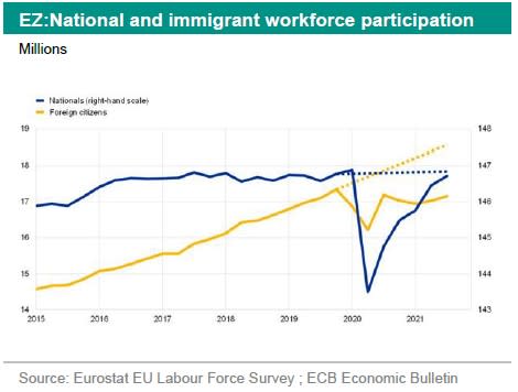 The Eurozone experienced a double dip in participation that followed the two large lockdown periods, but current participation rates are back to pre-pandemic levels. That said, participation is still below the pre-pandemic trend. Another factor, spotted by recent , that is currently is limiting labour supply in the eurozone is migration. Since the pandemic fewer people have migrated to the eurozone, particularly from non-eurozone EU countries, and many European workers from abroad have returned to their home countries. This has had a (likely temporary) downward impact on labour supply of about 1.5 million workers.