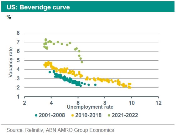 To assess potential sectoral mismatches the Beveridge curves is a useful tool. It plots the unemployment vis-à-vis vacancies. Close to peak tightness, the labour market swings to the upper left corner of the curve (with high vacancies and low unemployment). If the curve moves sideways to the right, this indicates sectoral mismatch, as vacancies stay open while unemployment is higher. The Beveridge curve of the US shows that de pandemic led to massive frictions in the labour market, as the green dots show that the curve is shifting sideways. Labour market frictions increased on the back of shifting consumer demand, which drove temporary shifts in labour demand (for instance from services to goods, and now back to services). While these labour market frictions are temporary as wages will eventually reallocate workers to the sectors with demand, it can in the short run drive wage increases.