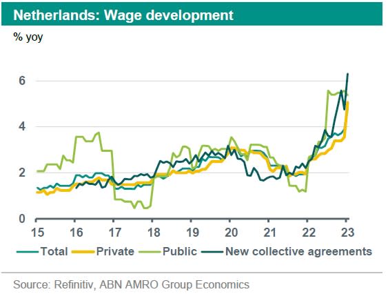 Two other factors are playing into current successful wage growth negations: the first is inflation itself. Consumer Price Inflation peaked at 14.5% in September 2022 (versus 10,6% in the eurozone). While the Dutch CPI figure was partly distorted (see here why), it encouraged labour unions to ask for much more compensation than they had in previous years.