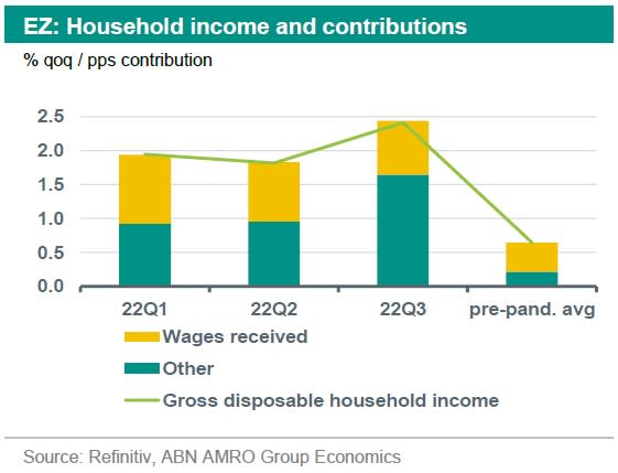 A second factor that played its part in the wage negotiations is government support. Throughout Europe gross disposable household income was massively supported by various government support schemes. For the Netherlands, these compensations schemes were in place as well, but the combination of extreme labour shortages and exceptionally high CPI figures has dominated negotiations.