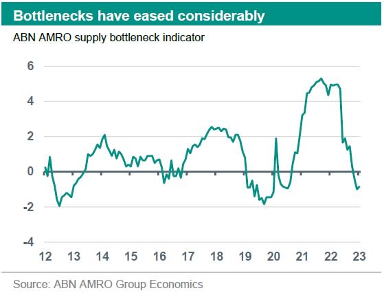 After the massive supply chain disruptions from the pandemic and the reopening, our ABN AMRO supply bottleneck indicator that combines many variables that capture these pressures, has eased back to pre-pandemic levels. This suggests that competitive pressures from global trade are back and are posing downside risks to the pass through of wages to prices. The broader trend of deglobalisation could in the longer run lower competitive pressures.