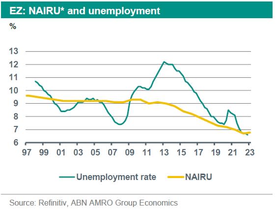 While unemployment has moved to a historic low of 6.6 percent in December 2022, the equilibrium unemployment (that estimates when unemployment levels become inflationary) has been moving down along with it since the eurozone crisis, as countries implemented labour market reforms and reforms to the social security and pension systems. These have helped to increase the activity rate in the Eurozone. According to estimates by the European Commission the unemployment rate was very close to the NAIRU at the end of 2022. This means that unemployment is almost at the level where it is inflationary. However, it is possible that the NAIRU has fallen below those estimates given that the impact of reforms continues to feed through.