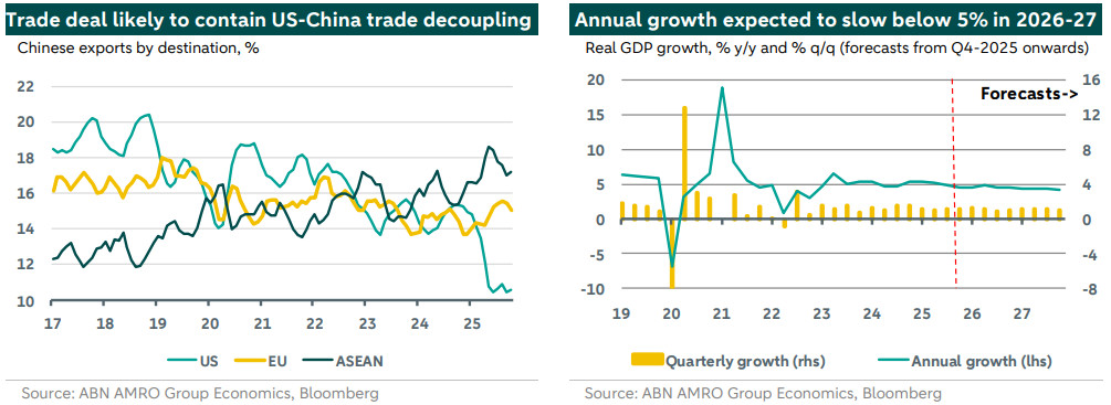Following the dramatic tariff escalation in April, market turbulence and corporate lobbying led to a US-China truce in mid-May, with tariffs settling at much lower levels. Trade tensions flared up again after this truce, with the focus shifting from tariffs to ‘chokepoints’ (rare earths/semiconductors). In October, China presented an even stricter export control regime for rare earths, intended to mirror a similar US regime on semiconductors to create leverage in trade negotiations (see ). The timing of this seems to be related to the recent US expansion of the entity list used for semiconductor controls with foreign affiliates. The rare earth controls also give Beijing leverage over countries that might team up with the US against China, similar to the US’s semiconductor approach. While the US initially threatened to re-install high tariffs and export controls on critical software, both countries ultimately found enough common ground to sign a new trade deal, agreed between presidents Trump and Xi end-October. This deal includes a one-year postponement of China’s rare earth controls, the expansion of the US entity list, and the increase in bilateral port fees. It also includes a cut of fentanyl-related US tariffs on China from 20% to 10%, reducing this year’s additional headline tariffs from 30% to 20%. China agreed to step up soybean imports from the US, and scrapped tariffs on US farm products. This deal prevents a harmful re-escalation of bilateral tensions for now, while leaving more fundamental trade/tech, national security and geopolitical issues untouched. All of this gives both countries time to further work on decoupling in sectors deemed to be of strategic relevance; we think that China is ahead of the US in this respect (see box in lead article). All in all, we assume the fragile equilibrium in US-China relations will hold in 2026. Still, trade spats between China and the US/West are likely from time to time, particularly around chokepoints, with the Dutch chips producer Nexperia being a recent example of a firm caught in the crossfire.